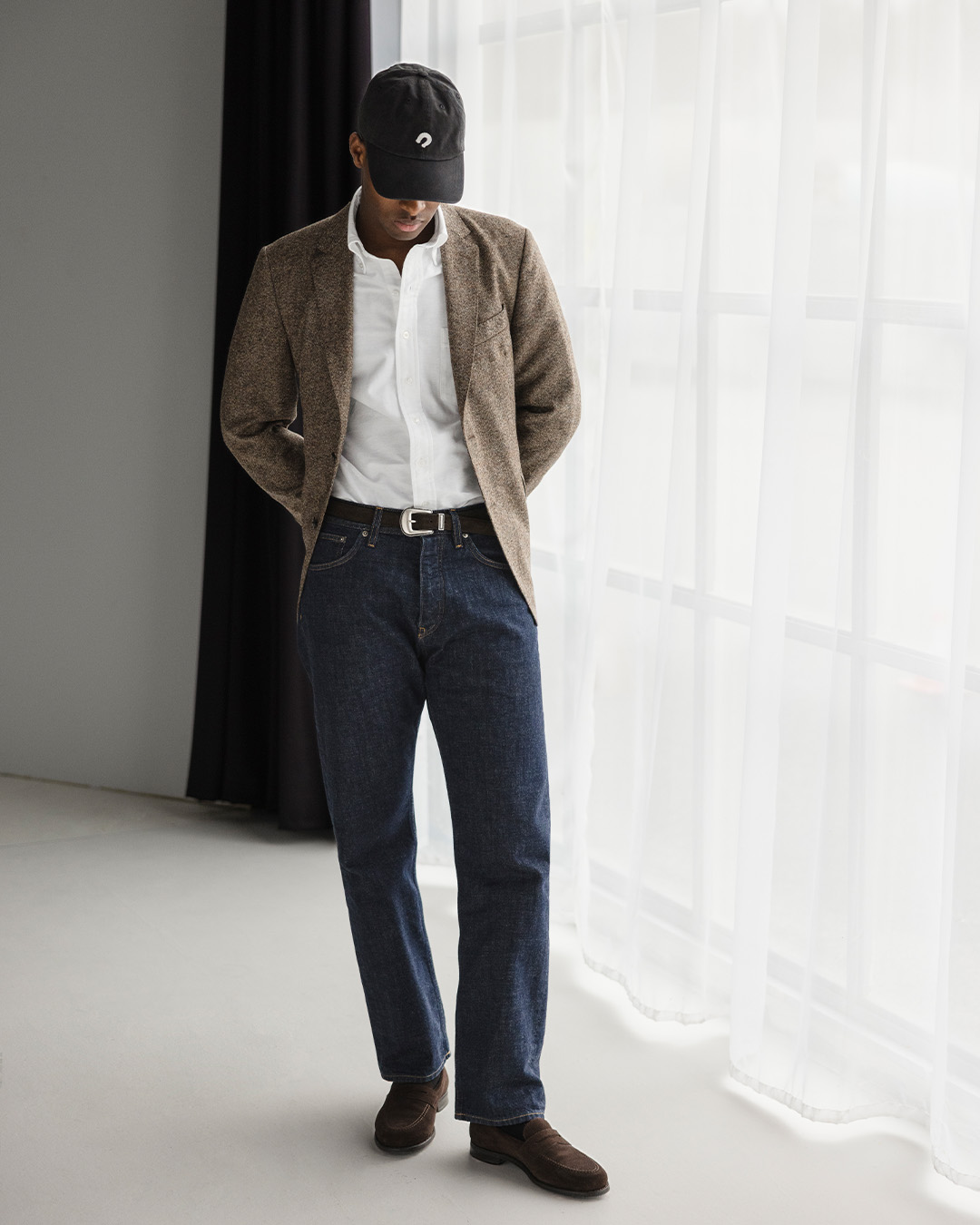 Rådenim fungerer også overraskende bra selv i mer oppstyrte sammenhenger. En blazer og hvit skjorte gir struktur, mens caps holder uttrykket avslappet og hverdagslig. Brune loafers binder looken sammen og spiller fint med den dype blå tonen i jeansene. Det er en kombinasjon der ingen plagg tar overhånd, men der helheten føles stilfull og bærbar – en påminnelse om hvor fleksible rådenimjeans faktisk er.
