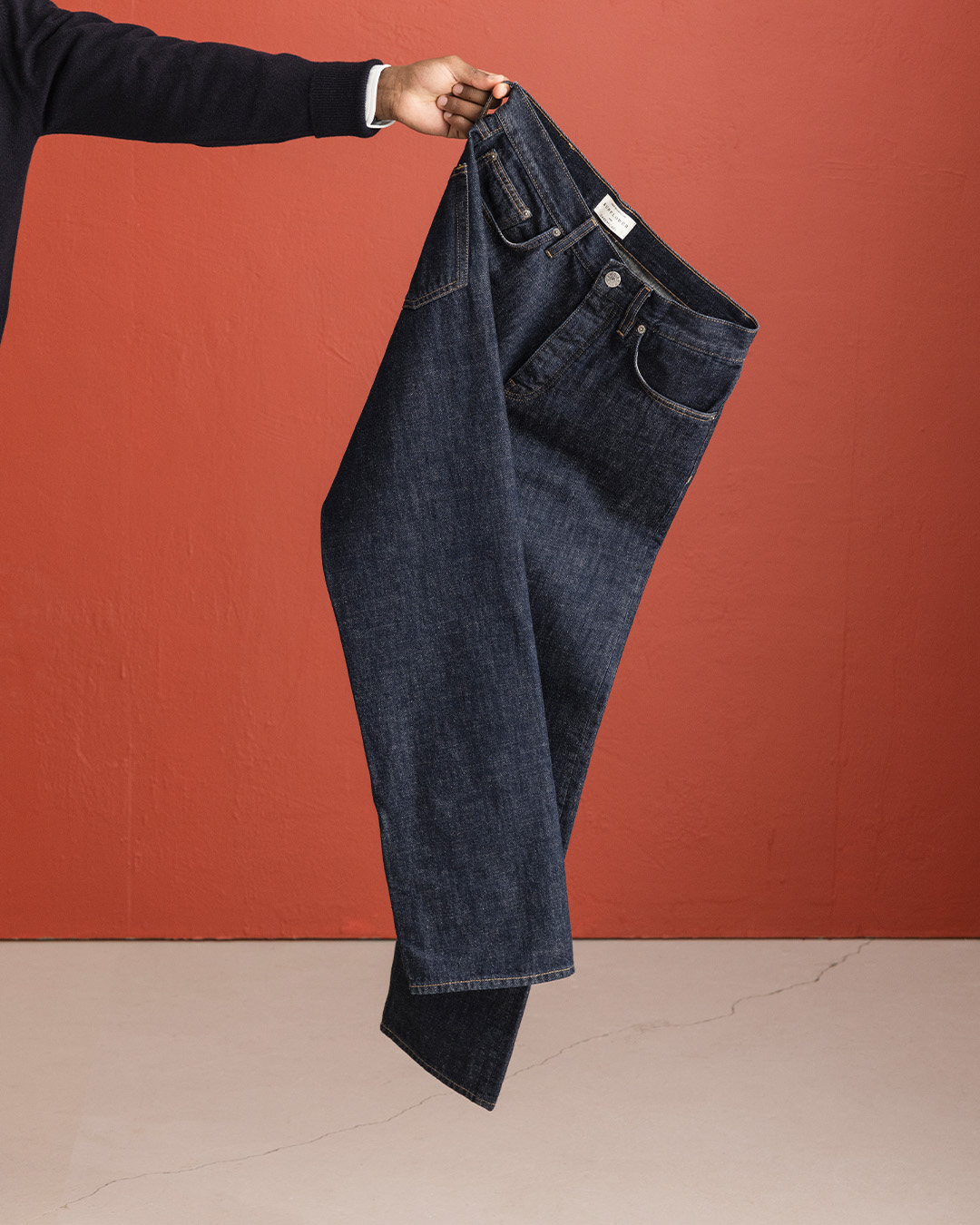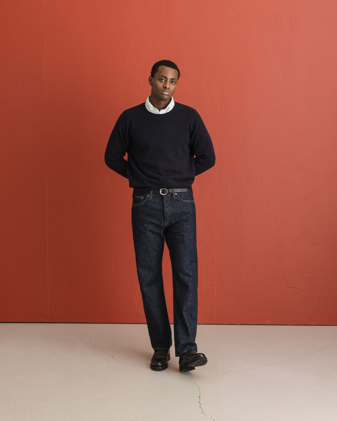 Rådenim gjør seg spesielt godt i en avslappet hverdagslook der materialene får snakke i stedet for å kontrastere. En blå genser i en nærliggende nyanse skaper et ton-i-ton-uttrykk som føles rolig og gjennomtenkt, mens et svart lærbelte og svarte loafers gir tydelige detaljer. Det er en enkel kombinasjon, men nettopp derfor fungerer den så godt – rådenimen får beholde sin karakter uten å føles pyntet eller tilrettelagt.