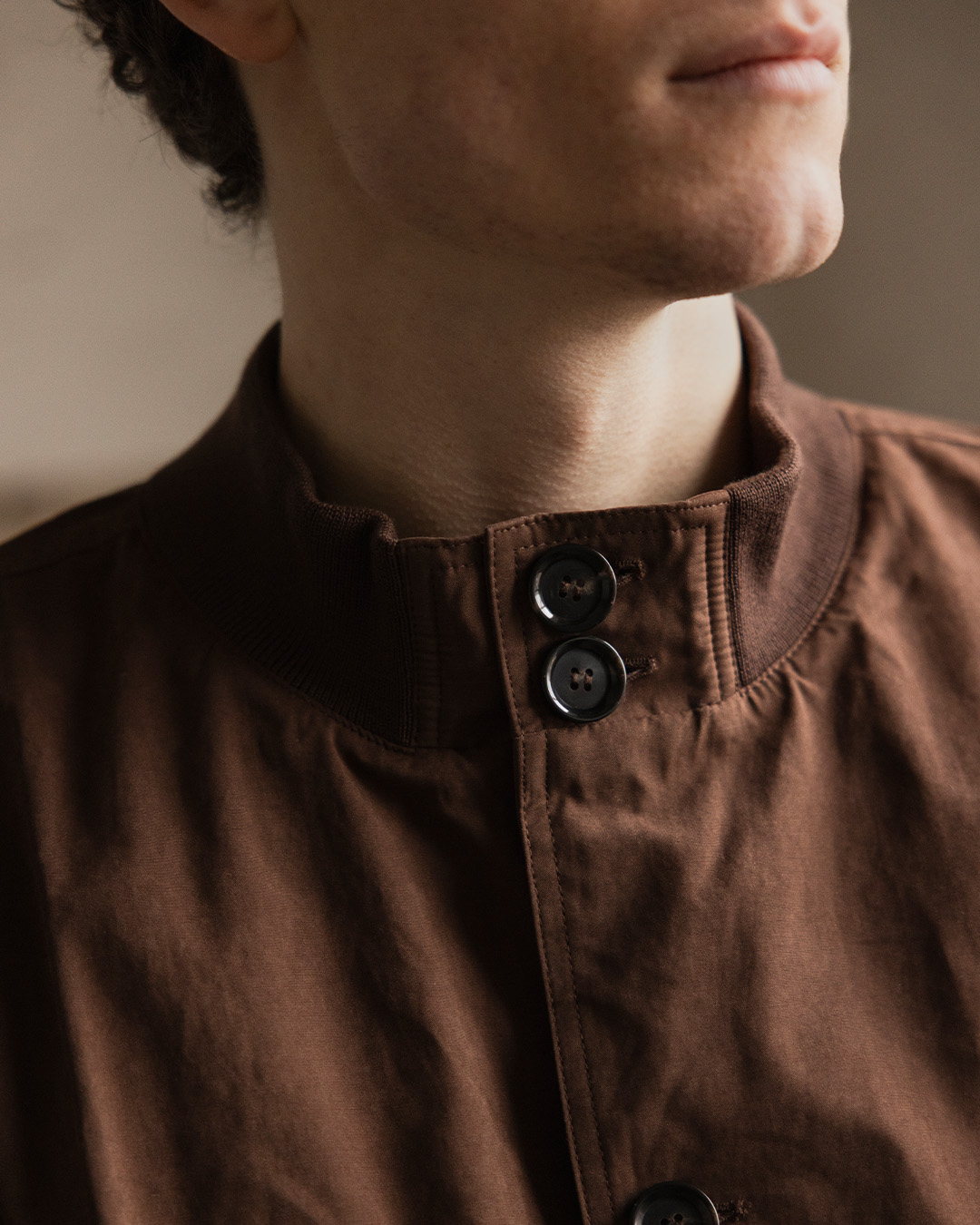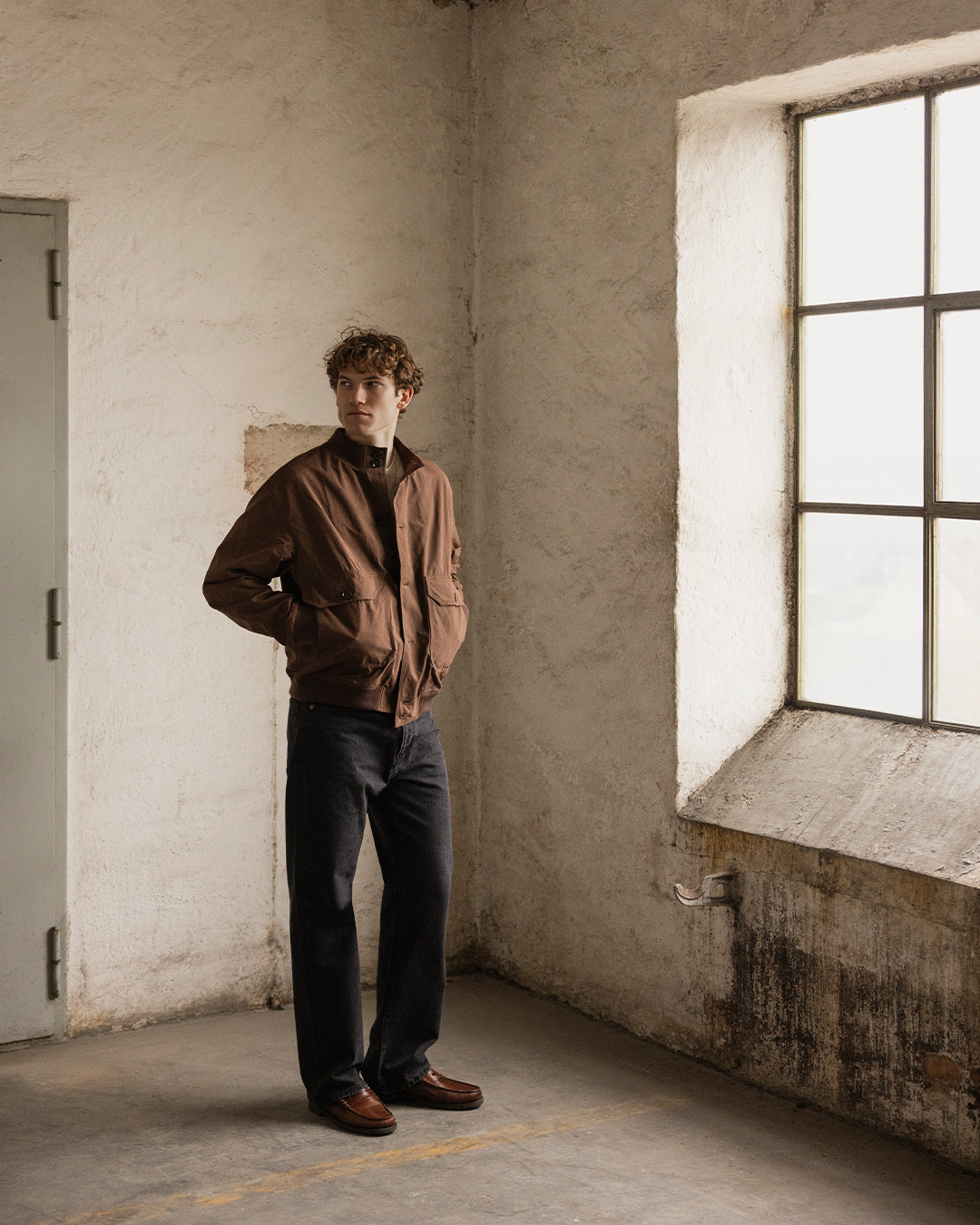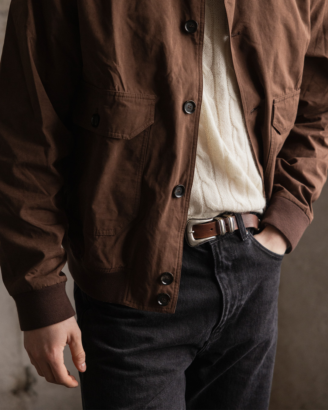Det er i jakken at fargen virkelig får vise sin styrke. En brun jakke eldes ofte vakkert og får med tiden mer liv, spesielt i materialer som ull, bomull eller semsket skinn. Den stilbevisste tør å kombinere svarte bukser med et par brune loafers som skaper en kontrast. Vi bryter av med en kremhvit strikkegenser som også gir en jordnær tone.