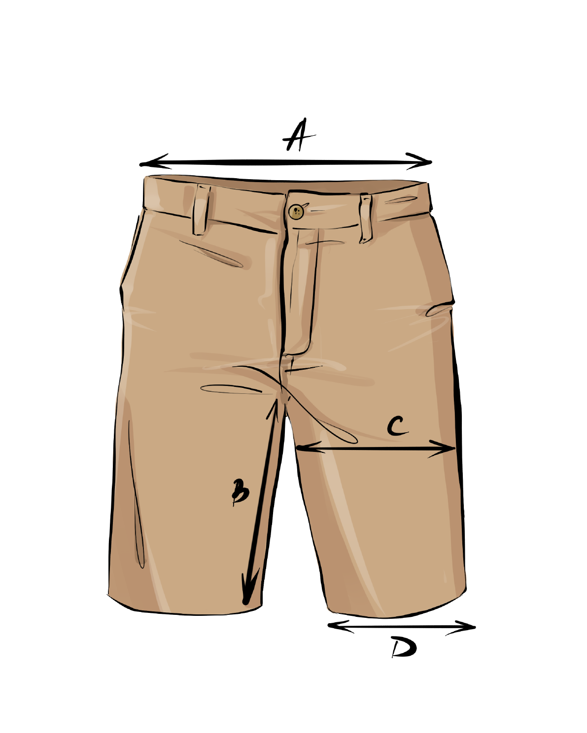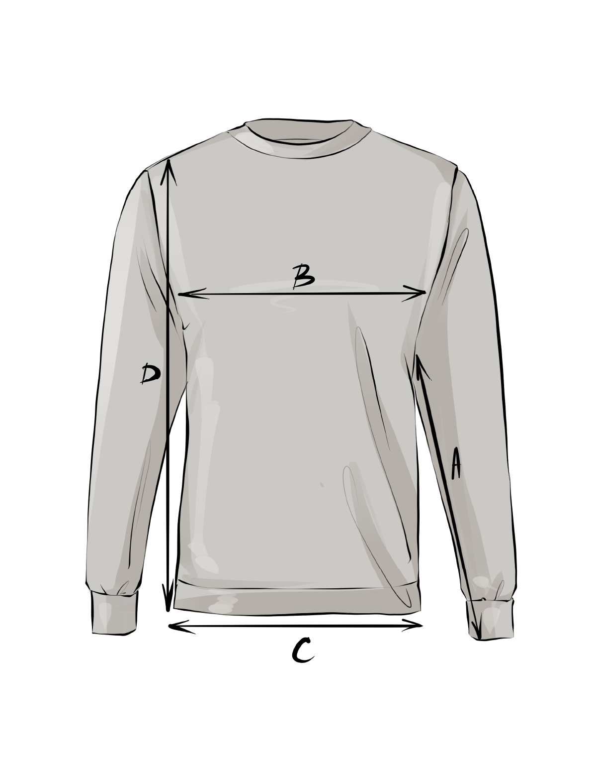 SkjorterA: Skjortearmlengde (cm)Ta mål fra midten av nakken ved kragesømmen, til nederkanten på armen (følg oversiden av armen). B: Brystvidde, omkrets (cm) Legg skjorten flatt. Ta mål fra armhule til armhule. Multiplisere med 2. C: Midjevidde omkrets (cm) Legg skjorten flatt. Ta mål fra kant til kant på det smaleste stedet i høyde med livet på skjorten. Multiplisere med 2. D: Plaggets lengde (cm) Ta mål fra midten av sømmen i nakken til nederste kanten på plagget. Se størrelseskonverteringstabell ovenfor ↑ |